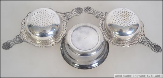 A pair of vintage silver plated Prima NS tea strainers, being marked to the underside together with one tray dish. Measures 15cm wide. Total weight 100.6g