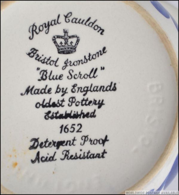 A stunning 20th century retro blue and white Royal Cauldon Bristol Ironstone breakfast set in the ' Blue Scroll ' pattern consisting of cups, saucers, side plates and breakfast bowls