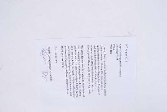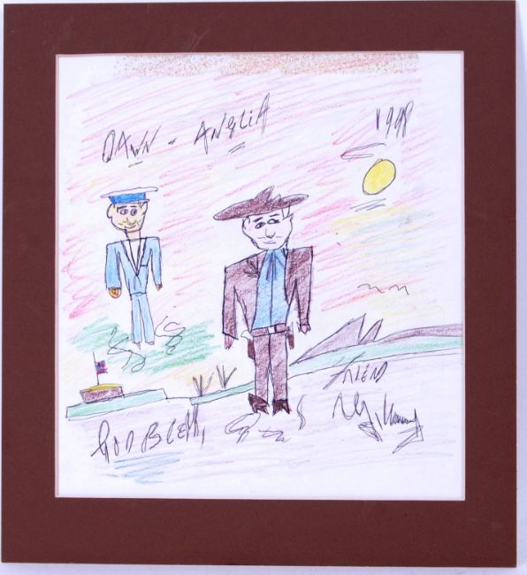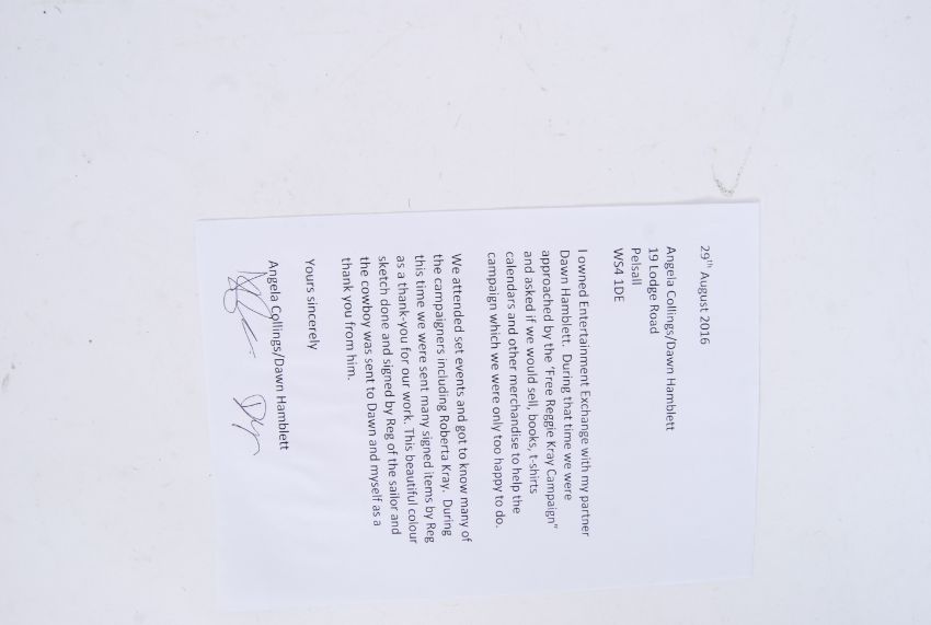 REG KRAY ARTWORK: A rare and original Reg Kray piece of art. Depicting his famous Sailor and Cowboy characters, the piece is full colour (in biro and crayon). Inscribed to the top 'Dawn & Anglia, God Bless, Reg Kray.'. Mounted. 30cm x 28cm total. Comes with a letter of authenticity detailing it being given by Reg Kray to supporters of the freedom campaign.