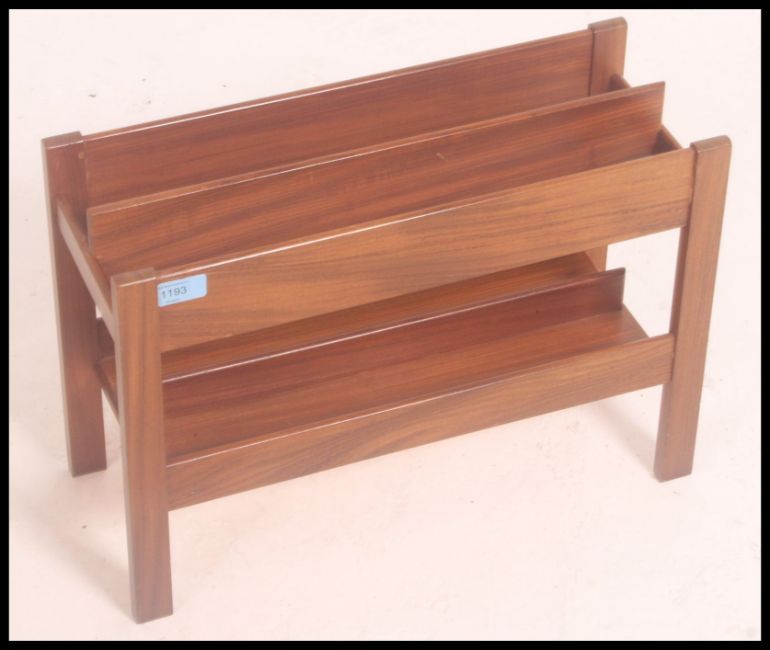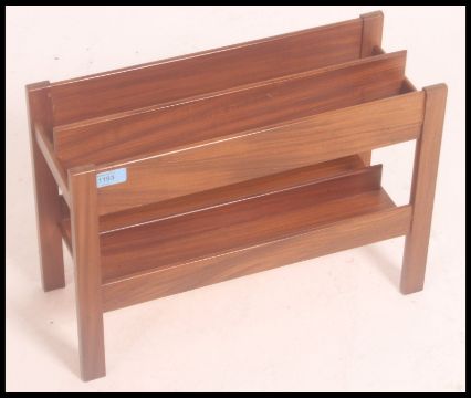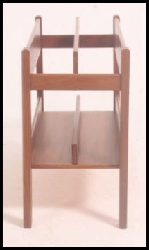 A 1970's Danish teak wood retro magazine rack - canterbury by Guy Rogers. The panelled body with chamfered edges raised on squared supports. Measures: 36cms high x 51cms wide x 28cms deep.