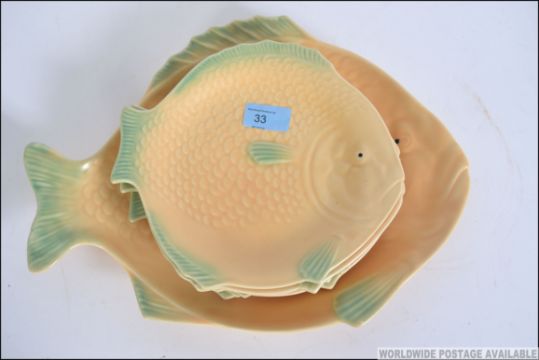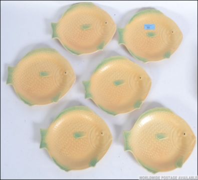 A vintage retro 20th century chintzy porcelain fish service by Shorter and Sons. To include a plater and six matching dinner plates. Stamped to the base. Largest 37cms wide.