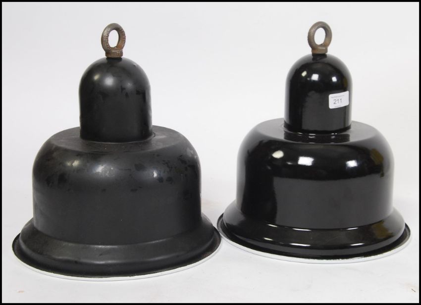A pair of Industrial 20th century black and white enamel factory pendant shades of unusual shape having original bulb fitments to the interior. 34cm high x 30cm wide