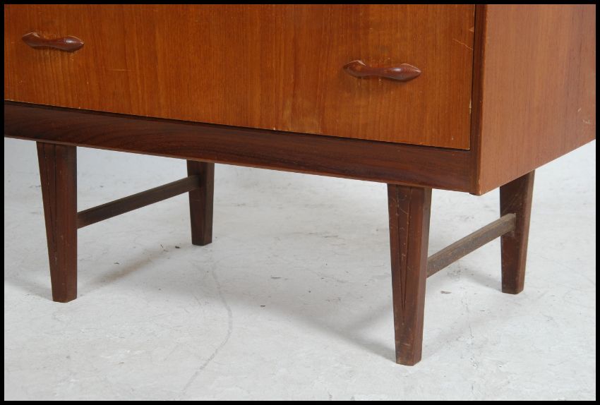 A Danish teak 1970's retro chest of drawers. Raised on tapered legs with an upright bank of drawers raised on tapered legs. Measures 92cm high x 77cm wide x 42cm deep.