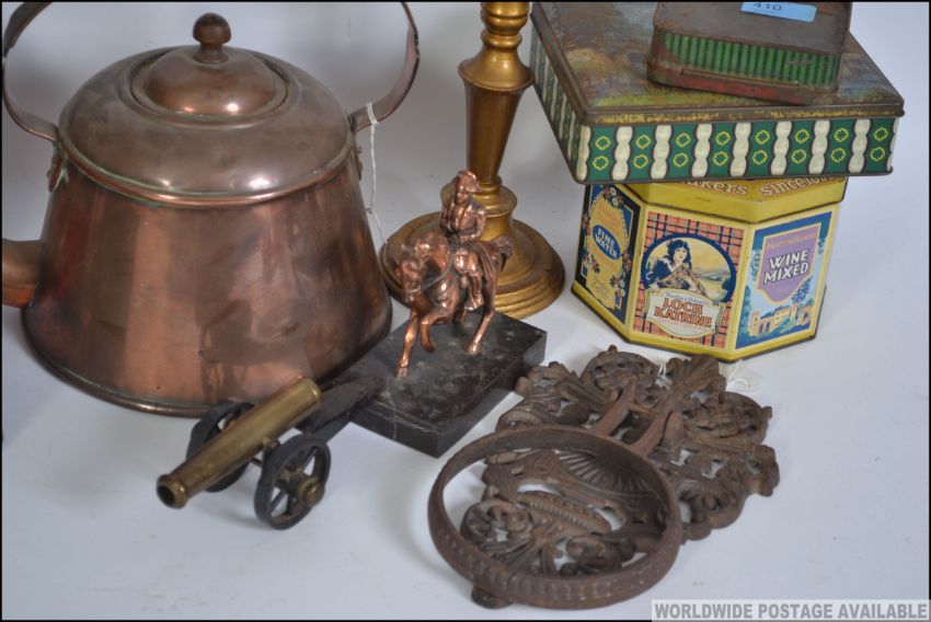A dealers lot to include tins, copper kettle, Victorian pewter kettle, candelabra, cannon, statue, pewter tankards etc