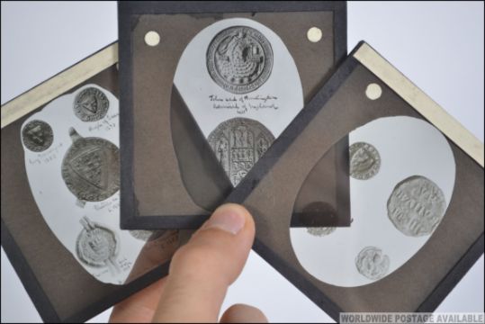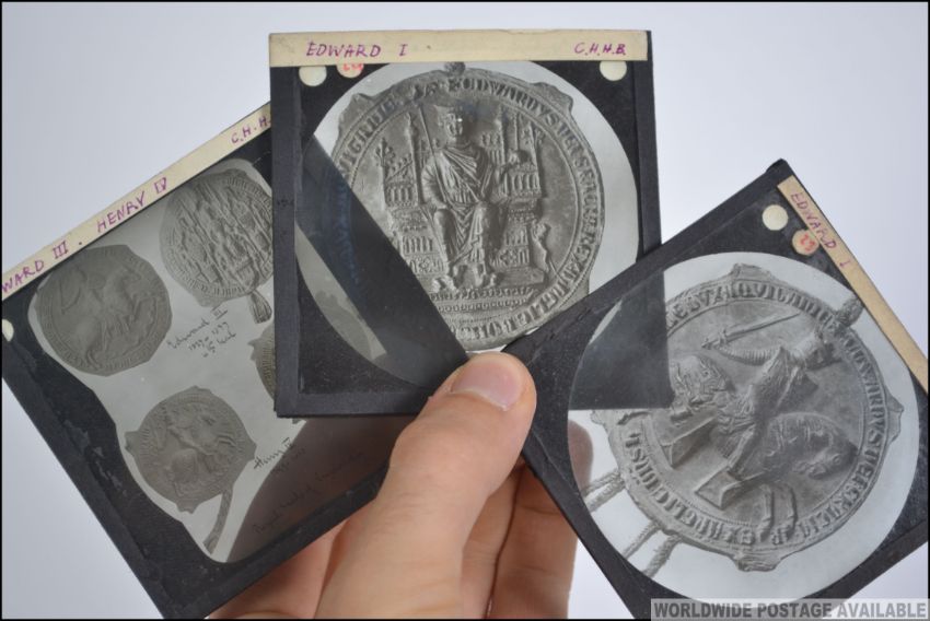 Two boxes of Magic Lantern slides with 50+ slides of Heraldic seals and 25+ slides of royal seals. Both sets are from the C.H. Hunter Blair Collection. Along with a book English Heraldic Book Stamps Figured and Described by Cyril Davenport printed in 1909.