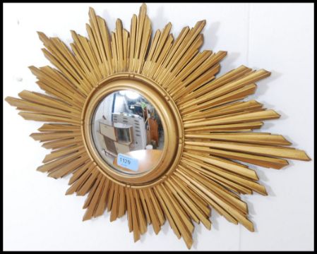 A stunning mid 20th century Gilt sunburst mirror. Constructed from wood with a fish eye - convex central mirror panel. Measures: 43cms high x 58cms wide.