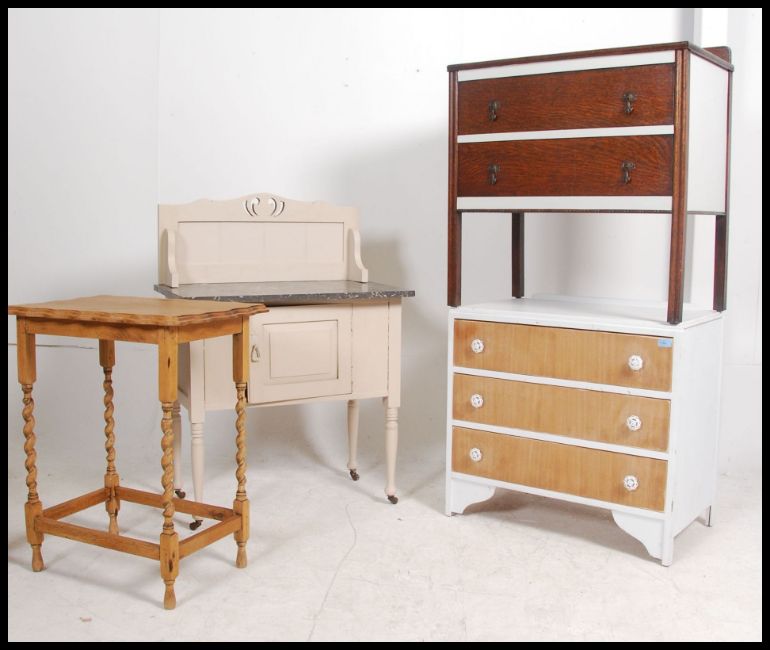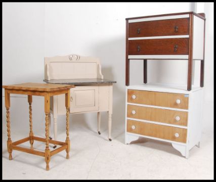 A collection of furniture to include shabby chic painted chests of drawers, circa 1940's together with a pie crust oak occasional table and an Edwardian painted marble top washstand. Measures 69cm high x 76cm wide x 44cm deep.