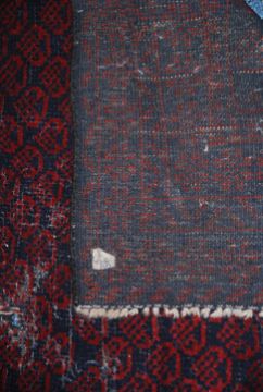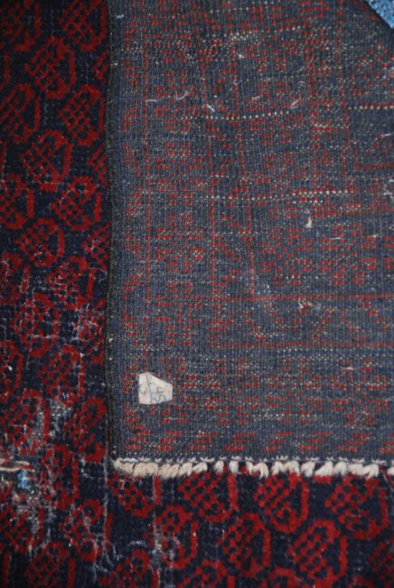 A 20th century Persian rug with unusual blue medallion design on red ground having geometric borders. Measures 180cms x 105cms
