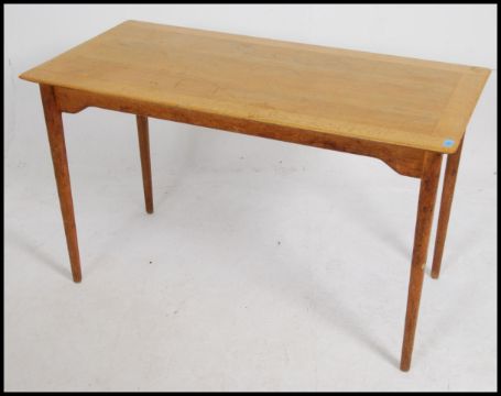 A 1920's golden oak Air Ministry library - writing table desk being raised on squared tapering legs with castors having flared chamfered edge top above. Measures: 73cms high x 122cms wide x 62cms deep.