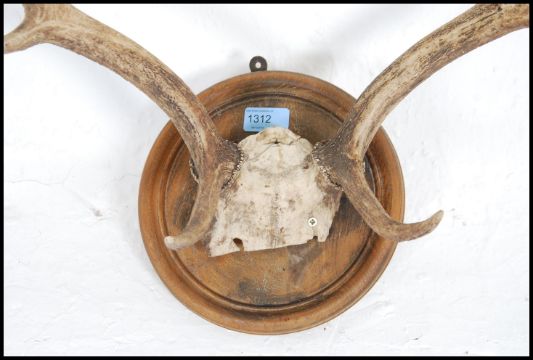 A taxidermy 18 point Stag Fallow deer antlers on cut frontlet mounted on an oak armorial shield back. Measures: 60cms high x 56cms wide.
