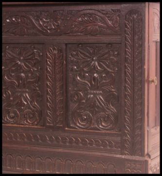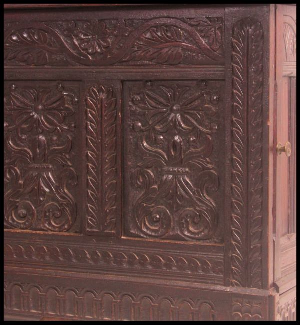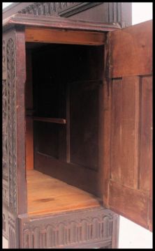 An 18th / 19th century carved oak Jacobean sideboard coffer being raised on stile legs with carved fielded panels having side opening panels with flared top and stage gallery back. Measures 121cm high x 144cm wide x 42cm deep.