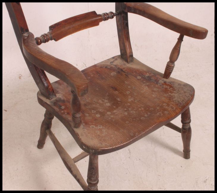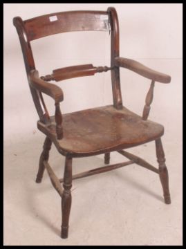 A Victorian beech and elm Oxford Windsor back back armchair having saddle seat and raised on turned legs united by stretchers. 84cm high x 55cm wide x 55cm deep