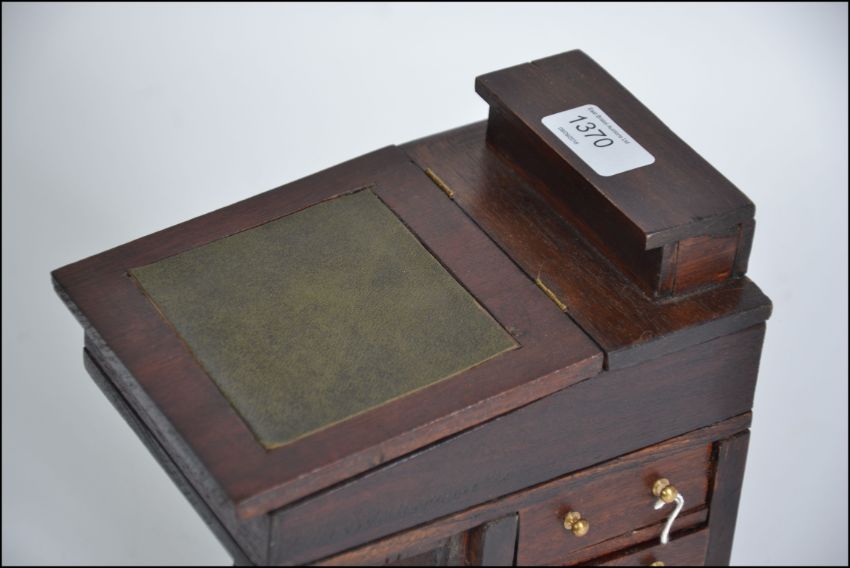 A 20th century Apprentice piece Victorian Davenport mahogany writing desk. The right hand side with a series of short drawers having inset leather writing surface atop being hinged with appointed interior H24xW19xD13cm together with a 20th century Apprentice piece twin pedestal oak writing desk. Each pedestal with a series of short drawers having inset leather writing surface atop H18xW31xD15cm