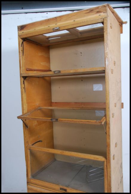 A 1930's shop display cabinet having a series of four up and over glazed doors with recessed handles over four drawers. Measures 204cm high x 85cm wide x 53cm deep.