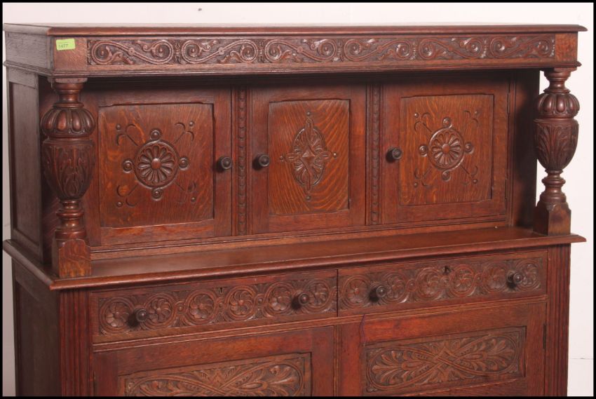 A Victorian Maple & Co carved oak court cupboard sideboard. The solid oak cupboard with twin doors under 2 short drawers with gallery upright top having cabinet flanked by carved columns. Black maple and co label to the drawer