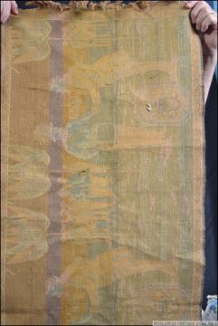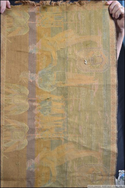 An early Edwardian 20th century framed and glazed 1908 tapestry for the Franco British Exhibition 1908, depicting scenes from the exhibition. Measures 145cms x 50cms