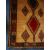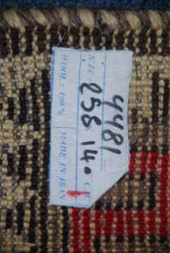 A handwoven beige Persian Rug of Iranian origin with central run of medallions having black ground borders with geometric running design. Measures 255cms x 140cms