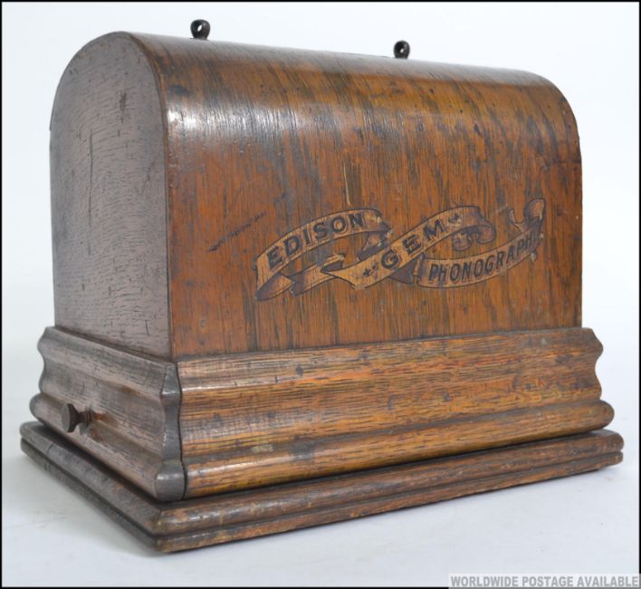 An Edison Gem phonograph complete with serial number being set upon a typical oak baize with domed cover having gilt notation. No horn