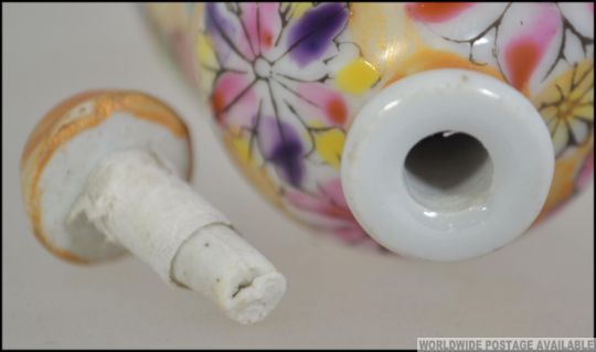 A Chinese famille rose porcelain perfume bottle of bulbous form with character marks to the base ( see illustration ). Measures 7cm high.