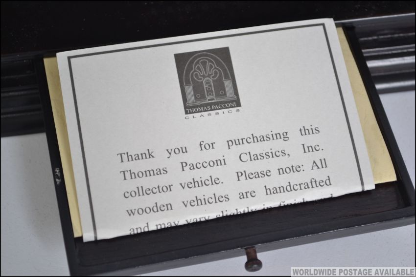 A collectable hand crafted Thomas Pacconi model wooden car, raised on a plinth base with certificate. Car measures 26cms long.