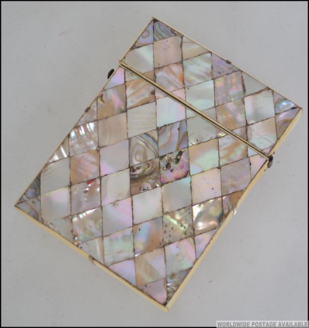 A 19th century Victorian mother of pearl chequer inlaid card case having hinged top with lined interior. Measures 11cms high.