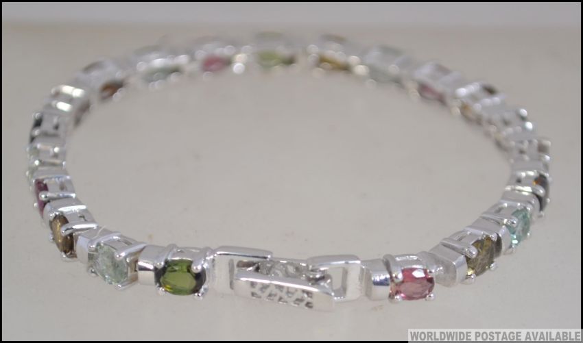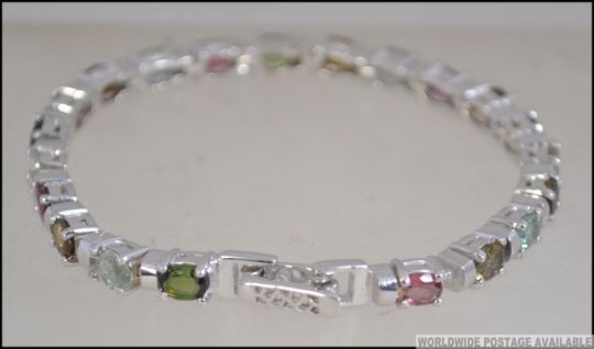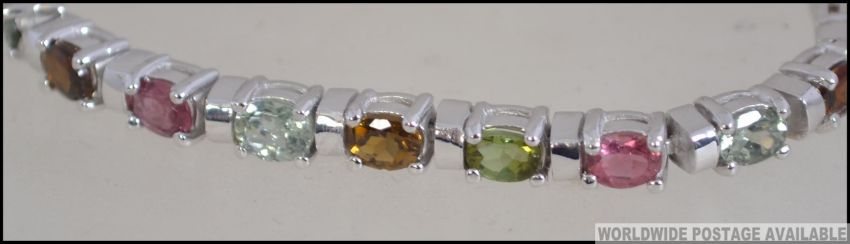 A silver and tourmaline line bracelet, each stone being multicoloured with double clasp. Size 16cms / weight 15.2g