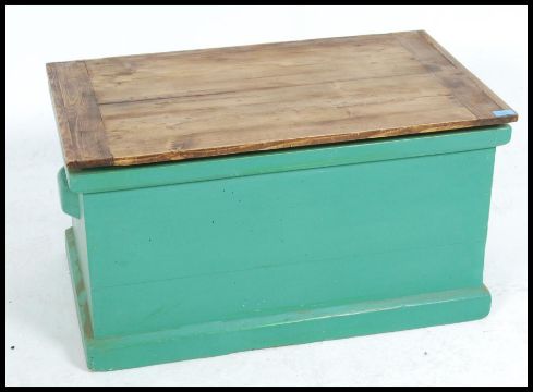 A Victorian painted pine blanket box in green. Plinth base with hinged waxed pine top over painted body. Measures: 48cms high x 85cms wide x 53cms deep.