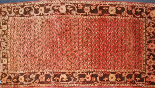 An early 20th century large Persian Bokhara rug with multiple field of unusual medallions having tree of life scrolled beige borders. Measures 265cms x 135cms