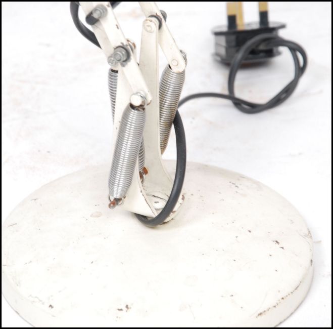 A mid century Industrial Herbert Terry anglepoise desk lamp raised on a white circular terraced base with pendant shade.