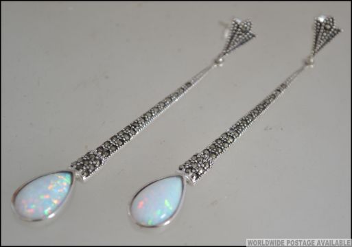 A pair of ladies silver marcasite and opal set Art Deco style drop earrings. Measures 6cms long / Weight 8.2g