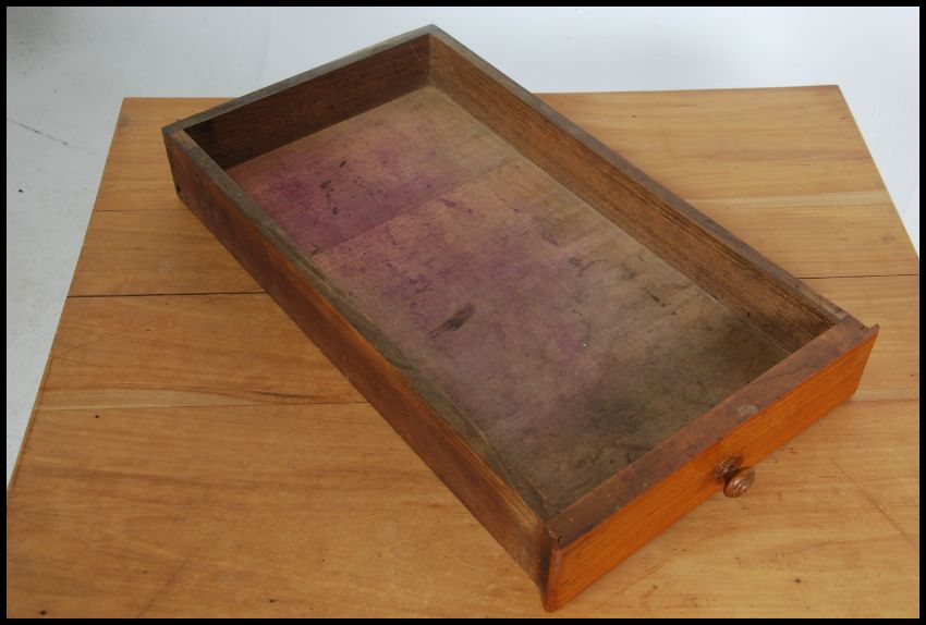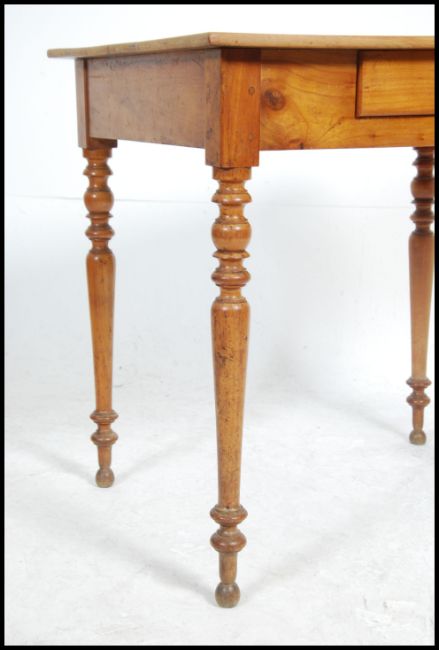 A 19th century French country fruitwood writing table desk being raised on turned legs with flared top over single drawer to the frieze beneath. Measures 73cm high x 76cm wide x 65cm deep.