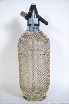 A retro mid 20th century mesh / chain mail covered glass soda syphon bottle. Measures 37cm high.