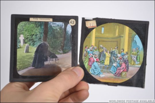 A 19th century magic lantern of metal and brass form together with a large collection of slides to include eclesiastical, architectural etc. Measures 44cms long.