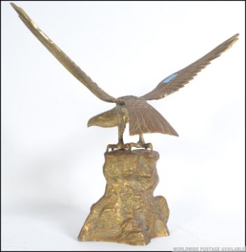 A 20th century cast brass ornamental Osprey Sea Eagle with wings at full span upon a naturalistic rock base plinth with waves crashing on to it. Measures 49cms high.