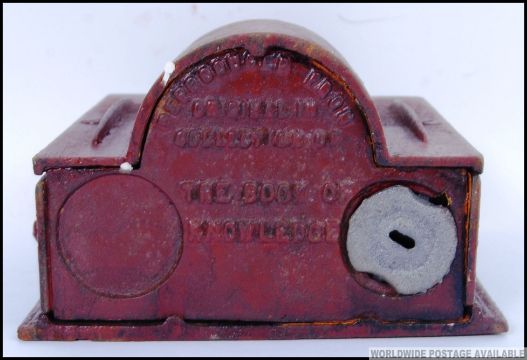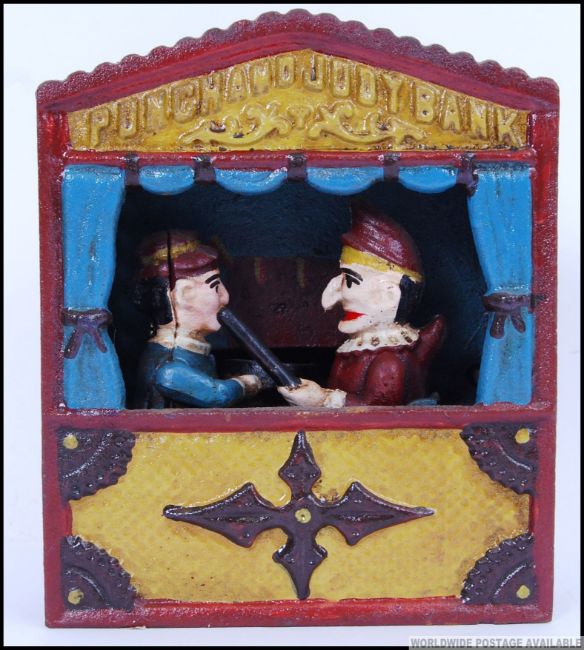 A vintage style, 20th century cast iron money bank of Punch and Judy in their puppet theatre.
