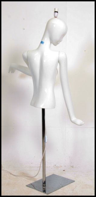 A vintage 20th century female shop display mannequin being raised on an adjustable chrome base. Being fitted with an unusual unique light fitting. Measures: 160cms high x 90cms wide x 60cms deep.