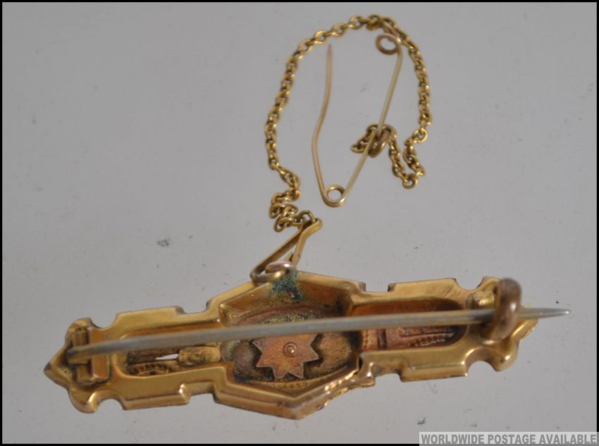 A 9ct stamped gold Victorian bar brooch having a central stone stamped to the verso 9ct. Total weight 2g.