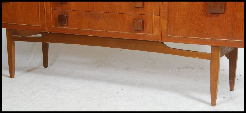 A retro 20th century teak effect sideboard having three drawers to the centre flanked on both sides by cupboard doors raised on shaped legs. Measures: 72cms high x 182cms wide x 40cms deep.