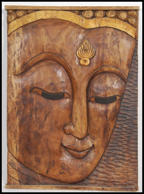 A good large wall hanging carved hardwood plaque of a Balinese bust of a female Asiatic deity
