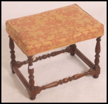 A Jacobean revival solid country oak foot stool in the 17th century style being marked to the underside for Parker Knoll. 46cm high x 59cm wide x 41cm deep