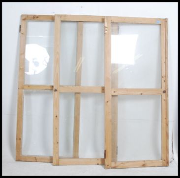 A group of three late 19th century early 20th century pine glazed cupboard doors. Measures 147cm high x 64cm wide.