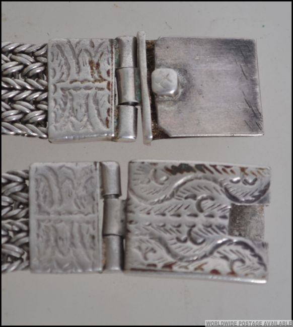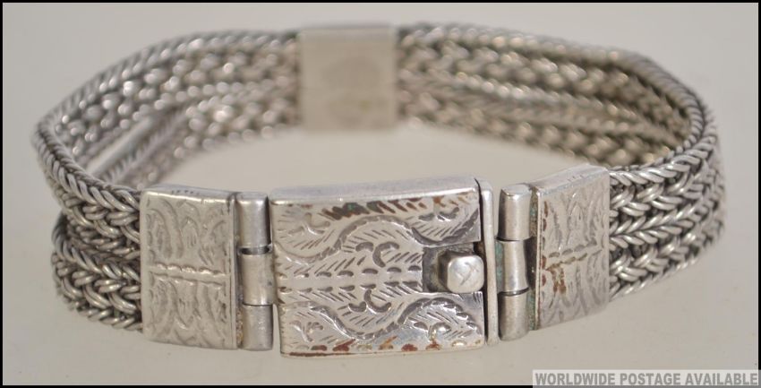 A 19th century Anglo - Indian hand made sterling silver double stranded herringbone wire weave with central tie back and wide press stud box snap, with two end tie blocks with chased design. Possible London import hallmarks for 1892. 20cm long 43.5g