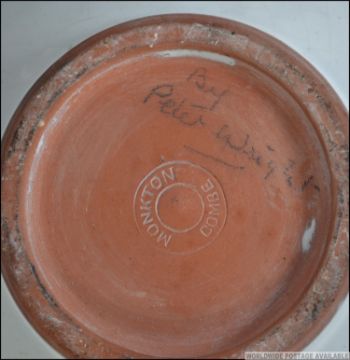 A group of three pieces of Studio pottery to include a two chargers and a bowl the chargers having geometric designs and the bowl with a female face. Two pieces signed to the base Peter Wright Monkton Combe and Clifford Wyndham. The largest measuring 32cm wide.