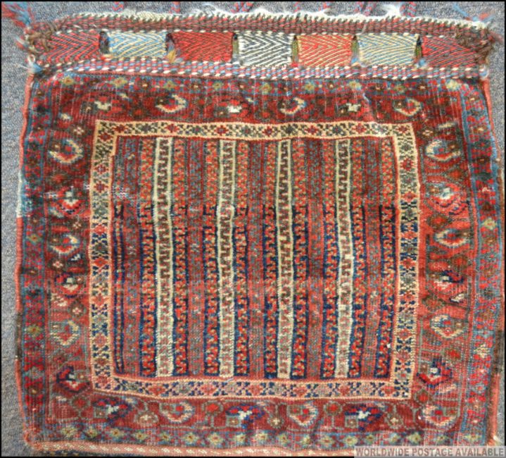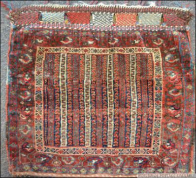 A Kamseh bag dating from the early 20th century. THe field with striped meandering design, attractive kelim back in place
