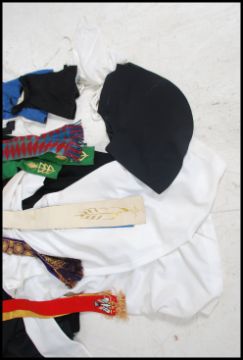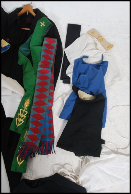 A collection of vintage priest / clergyman's robes to include cassocks, capes, hats, vestments etc. some with makers lables to include J. Whipple and Co Ltd all contained within a large whicker basket.