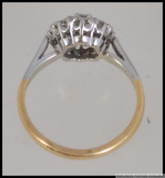 A ladies 18ct gold and platinum diamond cluster ring. The cluster head ring with central 45 pnt round cut stone with 2 pnt stones surrounded, total approx 65pnts. Stamped 18ct and platinum. Size L / Weight 3.1g