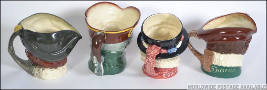 A collection of four large early ceramic Royal Doulton Toby Jug's. To include Beef eater's RD 5193, Turpin, Dickie and another. All stamped to base. Measures 17cms high.