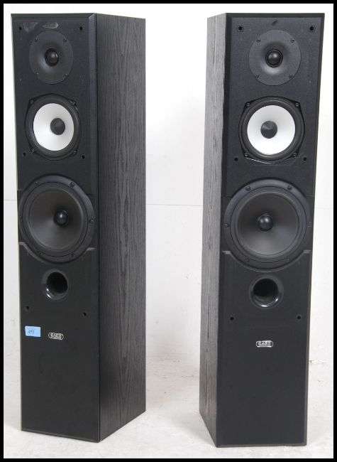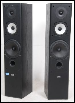 A pair of 20th century Acoustic Energy speakers of pedestal form having tall bodies with ebonised wooden finish