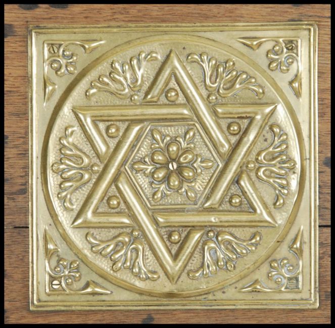 A Victorian oak and brass coal scuttle having brass star of david plaque to centre. Handle to top. Measures: 92cms high x 202cms wide x 54cms deep.