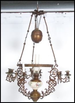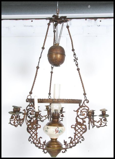 An Austrian early 19th century continental rise and fall oil lamp complete with ceramic reservoir and glass flue having milk glass shade. Measures: 95cms high x 65 wide.